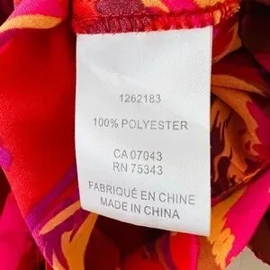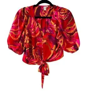 In great pre-owned condition! Vibrant red, orange and purple design. V neck button up with bow tie at the waist.