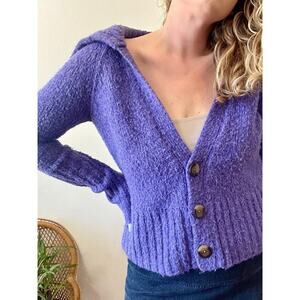 Gorgeous deep periwinkle v-neck cardigan with long ribbed cuffs and an oversized collar. So fun for cooler weather! This is a thicker wool acrylic blend.