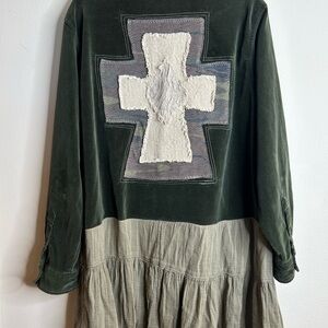 Stylish long sleeve shirt featuring a unique cross patch design. The dress combines green and gray tones for a chic look.