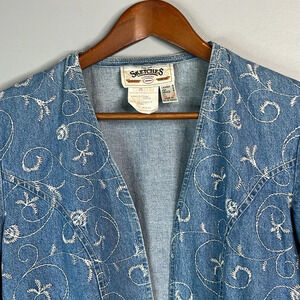 Y2K 90s Vintage Sketches Embroidered Denim Jacket Bolero Crop Blue Light Wash 4