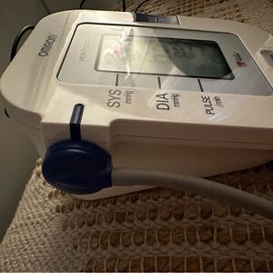 OMRON blood pressure monitor. Excellent condition. Rarely used. Use batteries or electrical outlet.