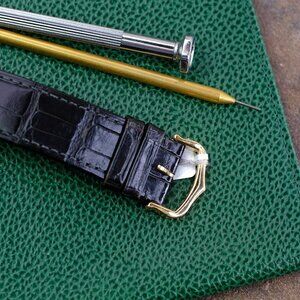 Bracelet / Strap: Black Leather Strap with Cartier 18K Rose Gold Deployant Buckle