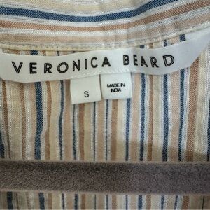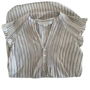 Effortlessly chic Veronica Beard Marieta dress in coastal blue/tan/cream stripes with a subtle metallic (lurex) shimmer. Split V-neck with 3-button placket, flutter sleeves, and gorgeous pintuck pleating front & back. Relaxed A-line silhouette with curved high-low hem—perfect for resort, brunch, or summer events.