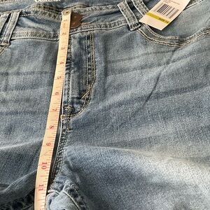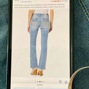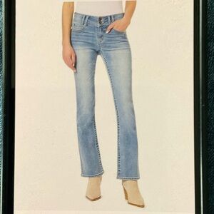 Stylish boot cut jeans by Wallflower. Light blue wash. Comfortable fit for everyday wear. inseam length is 30”. Color is called Cypress.
