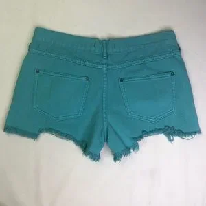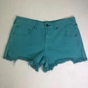 Stylish teal jean shorts. Frayed asymmetrical hem. Classic five-pocket design. Perfect for casual wear.