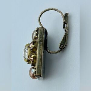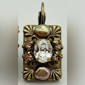 These vintage-inspired earrings feature a beautiful blend of gold and bronze tones, perfect for adding elegance to any ensemble. They showcase real pearls, accented with soft-orange and clear crystal accents. Truly stunning statement earrings!