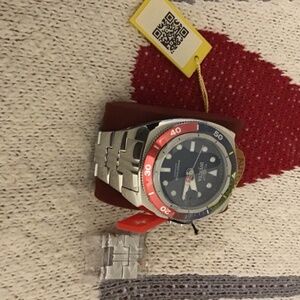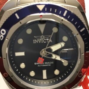 Blue & Red bezel -Pepsi. Automatic. Swiss made & stamped above 6:00. Swiss flag on seconds hand. Ronda R150. 46mm. Screw down crown. Sapphire crystal. * NEW. just sized for 7inch wrist. Extra links. No box, just watch & links. Beautiful Swiss watch. Tags attached as you see.