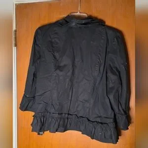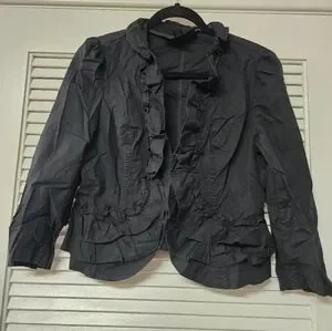 Add a touch of feminine flair to your layering pieces with this new with tags INC International Concepts open front jacket. Designed in a versatile black, it features playful ruffle trim along the neckline, hem, and sleeve cuffs for a chic, romantic finish. Crafted from a comfortable cotton-spandex blend, it offers both structure and stretch for a flattering fit. Perfect for pairing with dresses, trousers, or jeans for an elevated day-to-night look.