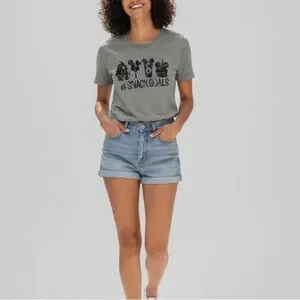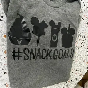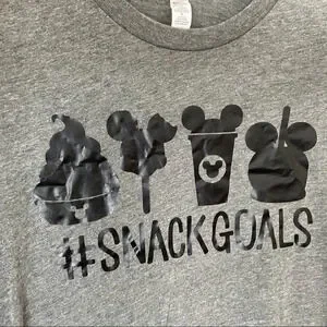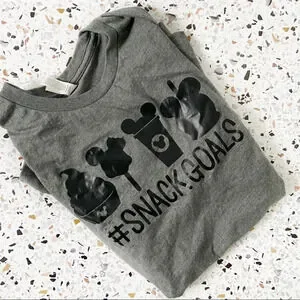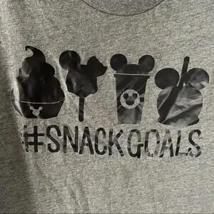 • features: This cute Disney themed snug fit graphic tee features "Snack Goals" text and iconic Disney snacks like Dole Whip and Mickey Mouse treats. The short-sleeve gray shirt is a comfortable, lightweight blend. It is the perfect piece for a Disney adult's trip to Disneyland or Disney World, offering a fun, casual and everyday style.