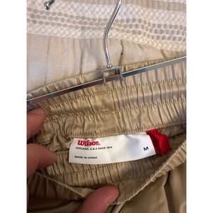 Elevate your athleisure game with these sleek Wilson Sporting Goods Co. satin jogger track pants. The lustrous tan fabric drapes beautifully, offering a sophisticated take on comfortable athletic wear. Elastic waistband with an adjustable drawstring ensures a perfect fit, while the subtle logo detailing adds a touch of brand heritage. Side pockets with zipper closures provide secure storage for your essentials. The cuffed ankles create a modern silhouette, making these pants ideal for a casual day out or a stylish travel