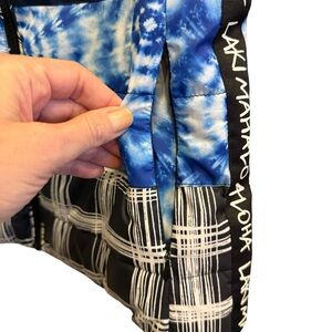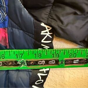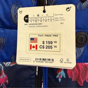 NWT. Bold puffer jacket by Desigual with a mix of floral, tie-dye, and plaid patterns. Features vibrant colors and a unique design. Side pockets.