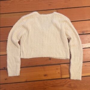 Chic cream cardigan with ribbed texture. Features a button-up front. Ideal for layering.