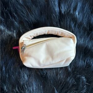 Stylish Off-White crossbody bag. Cream leather with a pink tag accent. Features a gold zipper.
