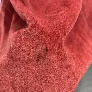 Back neckline: A few small pinholes and minor fabric thinning near the upper back seam.