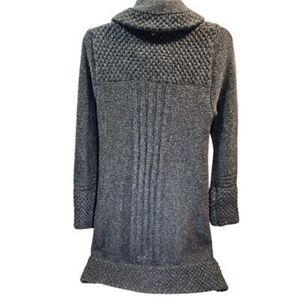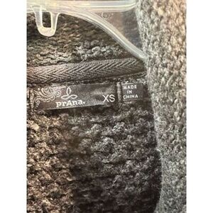 Keywords: Prana, coatigan, women's overcoat, gray coat, knit pattern, button closure, fall fashion, winter wear, spring style, organic cotton, recycled polyester, casual wear, office attire, functional pockets, EUC.