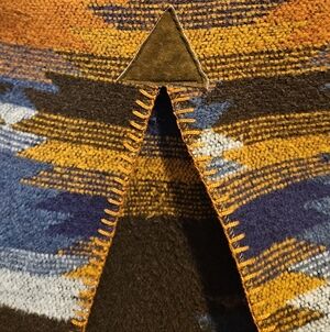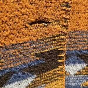 Stylish long cardigan with a Southwestern pattern. Features a mix of orange, blue, brown, and gray colors. Perfect for layering. 23" pit to pit. 49" shoulder to hem. Will fit up to a lg. snug when buttoned. Missing bottom button.