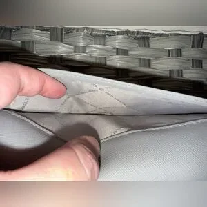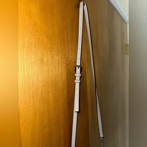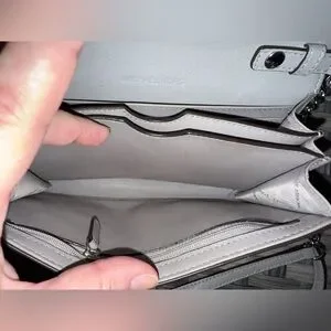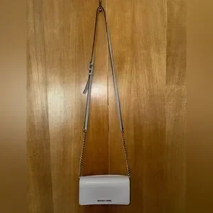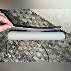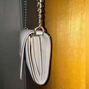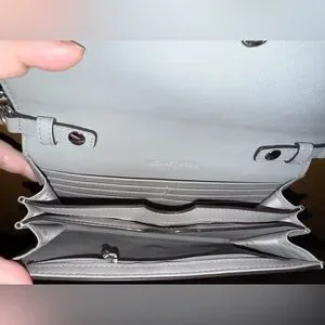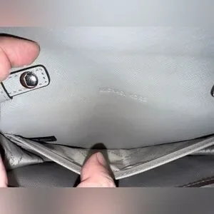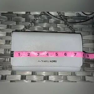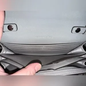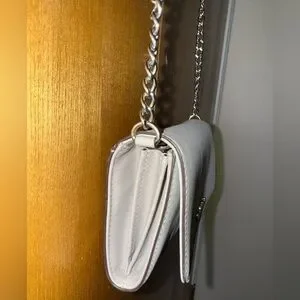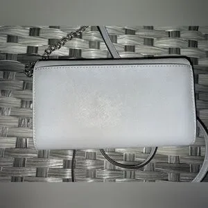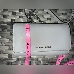 Stylish and functional Michael Kors Wallet on Chain (WOC) crafted in durable light gray Saffiano leather with silver-tone hardware. Perfect for travel, concerts, errands, or anyone who loves a hands-free, compact crossbody that still fits the essentials.