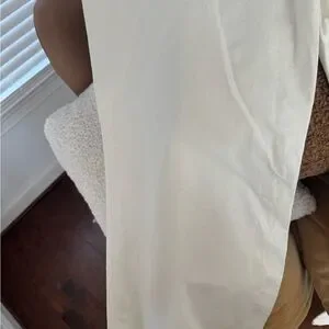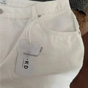 These trousers feature a high waist, a five-pocket design, straight legs and a material in cotton. These trousers come in off-white.