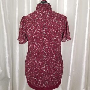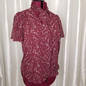 Beautiful maroon color, floral pattern all over, v-neckline and tie neck, short sleeves, front button closure. Great blouse for work!