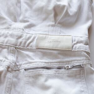 White denim (100% Cotton). Romper. Sleeveless. Collar. Front zipper fly with button closure.