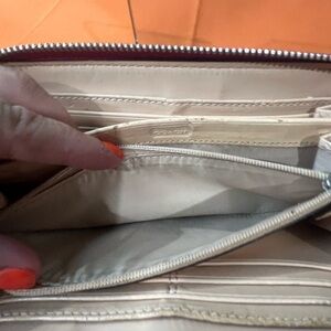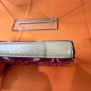 Stylish Coach clutch with signature pattern. Vibrant pink design. Secure zip closure. Perfect for any occasion.
