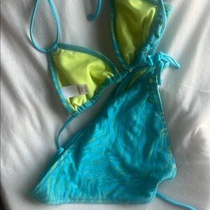 Vibrant turquoise and lime swimwear by BONGO. Features a stylish design. Ideal for summer fun.