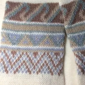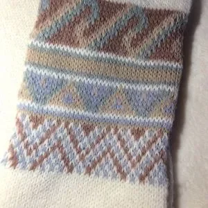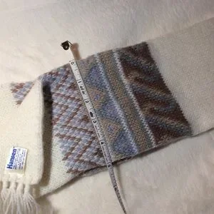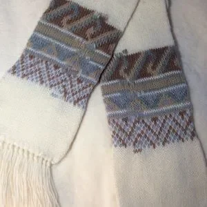 Vintage knit scarf 80s. Barely worn. Quality made in USA. 64” length without fringe. Soft off white with muted tan, gray, celadon green and light brown geometric pattern. Very pretty muted celadon green is hard to capture in photos. Looks beautiful with gray or brown leather or wool jacket. Has an angora feel. Normal variations in knit pattern on “back” side (photo 4) Excellent condition. No stains or holes noted.