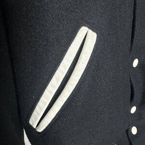 The VTG Holloway Mens Large Black Varsity Jacket is a retro-inspired piece from the 90s with a classic USA university style. Made of wool with a nylon lining, this jacket features white snaps and a snap closure. It is perfect for casual wear during the winter, fall, or spring seasons. Made in the United States, this jacket carries a touch of nostalgia and Americana flair.
