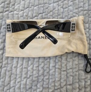 Stylish Chanel sunglasses with silver lenses. Perfect for a chic look.