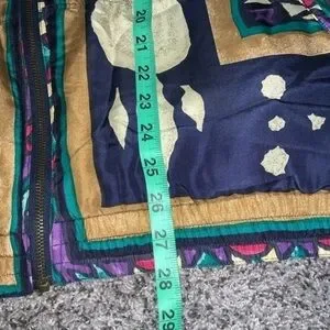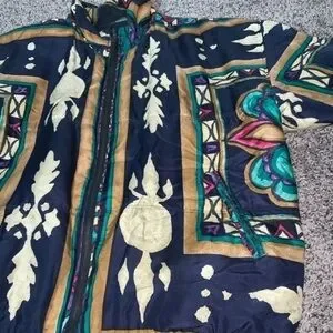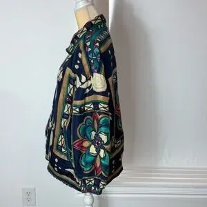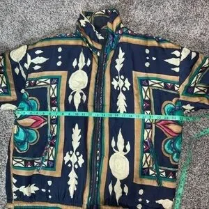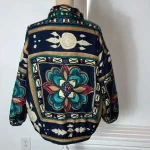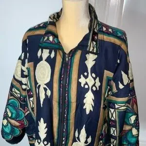 Totally awesome and unique piece!! Vintage 90’s Stunt Sports 100% silk boho/southwestern/Aztec/floral zip-up bomber jacket. Size 2X.
