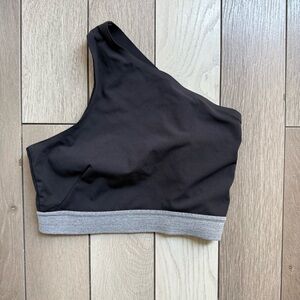 Stylish black one-shoulder sports bra with a gray band. Perfect for workouts. Check measurements, missing size tag, around to be size 4