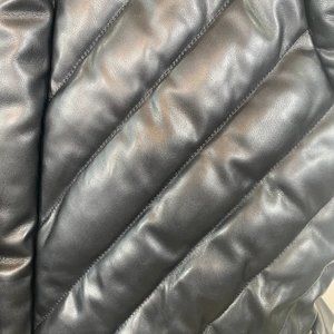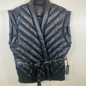 60% polyurethane, 40% viscose.Lining: 97% polyester, 3% spandex. Made in China. Spot clean only. Open front with detachable waist tie. Quilted faux leather fabric. Revolve Style No. BLAN-WO306. Manufacturer Style No. 01XP6632.