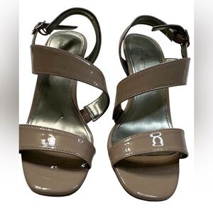 Elevate your style with Worthington's tan heels, featuring a sleek patent leather finish and a minimalist design. The wide horizontal straps provide a chic and elegant look, making them a versatile addition to any wardrobe. Perfect for any occasion, these heels effortlessly complement a variety of outfits.
