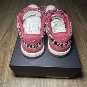 Bold AMIRI sneakers in red and white. Features leopard print details. Stylish and comfortable for everyday wear.