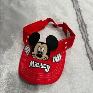 Red visor hat featuring Mickey Mouse design. Perfect for casual outings.