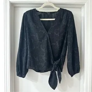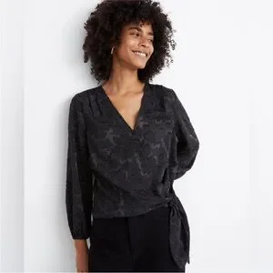 Madewell Black Floral Jacquard Side Tie Wrap Top, Size Medium
