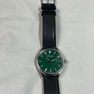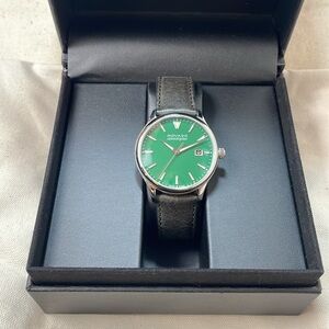 Movado Heritage Quartz Green Dial 40mm Men's Watch. Good used condition with pristine sapphire crystal and a few small, faint scratches around the polished stainless steel bezel as shown in photos. Includes very comfortable original leather strap, nicely worn in, and Movado box. Covershot for style only. See photos of actual watch for color and details.