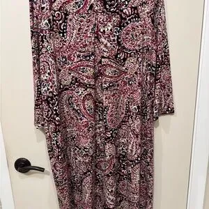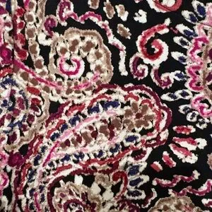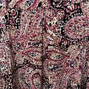 Elegant paisley dress with a bold pattern. Features pink, raspberry, periwinkle, cream, and black colors.