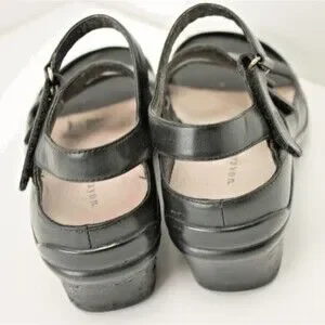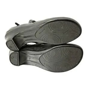 These Aravon sandals are a stylish and comfortable option for women in size 9.5 US (7.5 UK). The black leather material and strappy design with a mid-height cone heel make them perfect for both casual and dressy occasions. The Monica model features orthopedic support and an adjustable strap for a customized fit, ensuring both style and comfort for all-day wear. Ideal for those looking for a combination of fashion and practicality in their footwear. Good Pre-Owned Condition.