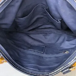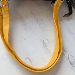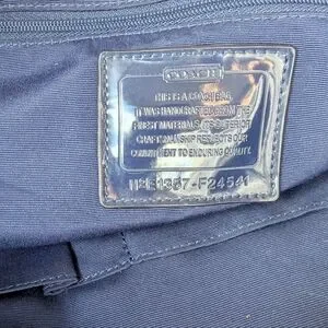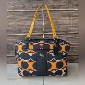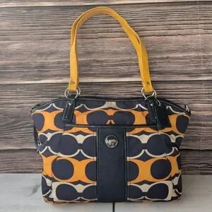 Chic Coach shoulder bag with striking black and orange design. Features sturdy handles and signature logo detail.