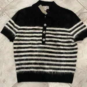 Stylish crew neck sweater. Features black and white stripes. Short sleeves with button detail.