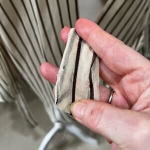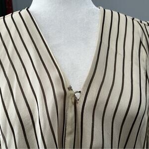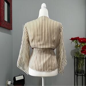 Beautiful New w out tags Silk Wrap Tie Front Ruffle Flutter V-Neck Semi Sheer Cream and Dark Tan Brown Striped Blouse by Richard Malcolm at Nordstrom features a Lined Bodice and Sheer, Loose Butterfly Wing Statement Sleeves. Double Snap Closures at Breast and Waist. Single Button Closure at Breast. Silk Tie Belt at Waist. Size Medium.