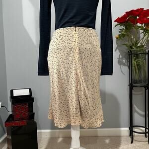 New without tags Gorgeous Vintage 90s East Coast Chic Two-Tone Pale Yellow and Navy Blue Small Floral Flutter Hem Classic Knee Length Skirt by DKNY. Rear Zipper and Hook and Eye Closure. Lightweight. Lined. Women’s Size 6.
