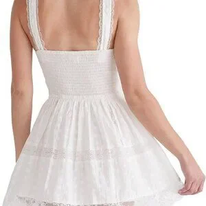 Features: A slim-fit mini dress with a charming corset-style pintuck waist, delicate lace detailing along the top neckline, and a beautiful embroidered floral eyelet fabric. The front neckline has a subtle slit with a cute self-tie, adding a touch of flirtiness. The straight hem hits most above the knee at about 33.5 inches long. Easy pull-on style with an invisible side zipper for a smooth silhouette.