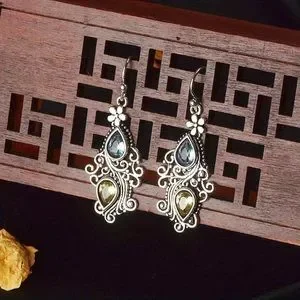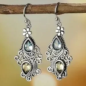 Vintage Silver Floral Gemstone Dangle Boho Earrings Nwt
