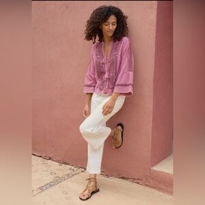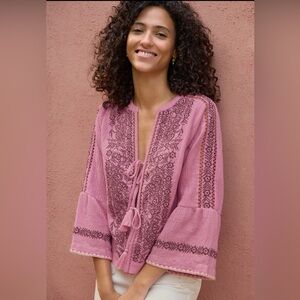 Style: front tie ,eyelet design , bell sleeve embroidered ,boxy fit,gathers from back neck for a fuller swing look ,v neck