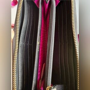 Excellent like new condition. One exterior compartment. One interior zipped compartment. Multiple interior card slots.