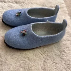 Step into comfort with these elegant blue women's slippers, featuring a charming beaded detail. Hand made with 100% natural sheep wool. They are cozy, durable, light weight, breathable, warm. They have soft suede outsoles and are made with genuine eco friendly felt. Can be used as an essential oil, aroma diffuser. Wool is not only comfortable, but maintains body temperature as well, also helps with blood circulation issues, rheumatic pains, diabetes, bunion, swollen, cold feet.