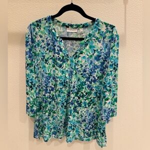 Susan Graver Blue and Green Patterned Blouse 3/4 sleeve