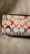 Chic Coach wristlet with bold red and blue signature design. Ideal for a stylish touch.